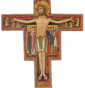 François a cependant connu une image du Christ en croix qui est devenue célèbre grâce à l’expérience qu’il en a faite. Il s’agit de la grande croix qui se trouvait dans la petite église dédiée à Saint-Damien, pas très loin d’Assise. C’est en priant devant cette image qu’il a entendu le Christ lui confier la mission de sa vie : Va, François, répare ma maison qui, comme tu le vois, tombe en ruine.